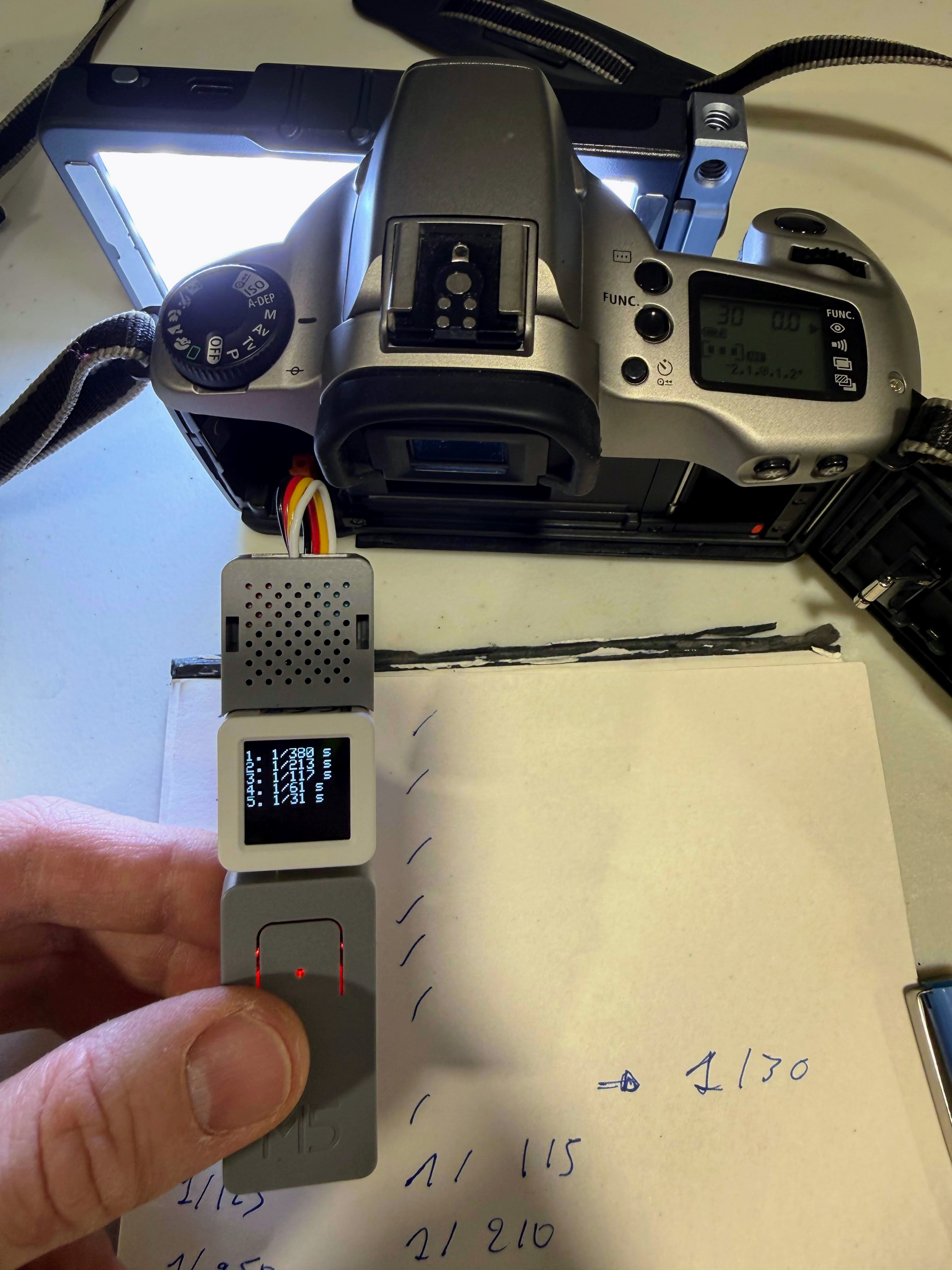This is an ESP32-based device designed to accurately measure camera shutter speeds. It uses a light sensor to detect when the shutter opens and closes, calculating the exact duration with microsecond precision. The device displays the last 8 measurements on its screen and outputs detailed readings via serial console.